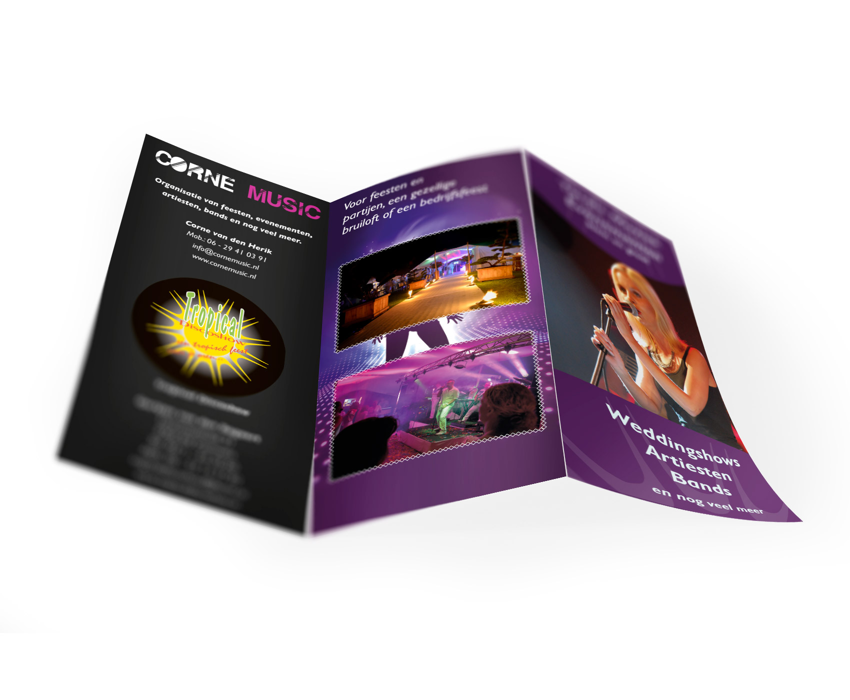 Voor Corne Music uit Eethen is er een 3 luik folder gerealiseerd om de promotie van zijn bedrijf voor feesten en partijen te vergroten.
